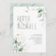 Delicados arreglos de vegetación inspirados en la naturaleza, incluyendo eucaliptos de goma azul con salpicaduras de dorado y de hojas de oro junto con diseños únicos, hacen de este hotel un emocionante boda para cualquier época del año. La invitación a la boda que se muestra aquí incluye frondosos bordes folláricos en la cara frontal y una textura suave de color agua en la parte posterior. Vea el vínculo de colección en esta página para ver todos los elementos coincidentes de este hermoso diseño o busque ID817 para ver otras piezas y opciones de color para este conjunto.
