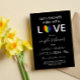 Encantadora invitación de la ducha de pareja lgbt con corazón del orgullo arcoíris en vamos a ducharlos con amor contra un fondo negro.