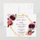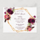 Una invitación a la ducha de novia al estilo boho. Delante: fondo blanco con un marco falso de forma geométrica de oro. Decorada con flores oscuras de color burdeos y rosa, rosas y plumas de estilo boho. Plantillas para el nombre de la novia y los detalles del fiesta. El nombre está escrito con un guión de estilo con letras a mano, letras de color borgoña.