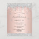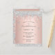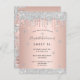 Una invitación de invierno moderna, elegante y glamurosa para una fiesta de 16 y 16 años. Un rosa dorado fino fondo metálico con elegante dorado rosa, rosado y falso purpurina plateado goteo, pinturas goteo. Decorado con falsos cristales de nieve de plata, copos de nieve. El nombre está escrito con un guión moderno de estilo con letras a mano de color gris. Personalice y agregue un nombre, edad y detalles de su fiesta. Sugerencia: Si no desea que se vea como una postal, haga clic en personalizar, vaya a la parte posterior y quite el separador y el sello postal.