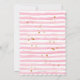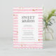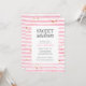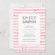 Invitación a la fiesta de cumpleaños dieciséis, moderna y de moda, con franjas acuáticas rosas y una página trasera a juego y un borde de vieiras. © Mini Impresiones Moi