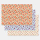 Dibujado a mano. coordinación de diseños en colores brillantes y alegres de mi colección Bee Lines. Una hoja de estampado floral de ladybug, una hoja de setas de fresa y una hoja de rodajas en azul.