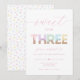 ¡Diviértete con nuestra invitación de cumpleaños a la helada "Sweet to be TREE"! 🍦 🎉 Celebrar el tercer cumpleaños de tu pequeña con esta encantadora invitación, con letras de helado pastel y rociadas que marcan el tono para una celebración súper dulce. Personalice su invitación con todos los detalles de su fiesta para crear una invitación única y encantadora que hará que los invitados se entusiasmen con unirse a la dulce celebración! Dulce por ser tres. Crema de hielo. Cumpleaños 🍨 tres dulces.