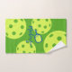 Toalla de mano de pelota personalizada para sudor impresa con un nombre o texto personalizado en una divertida y divertida fuente de escritura femenina con un simple monograma de remo de pelota de pickleball y fondo de bola de pickleball en verde brillante, y azul hace un regalo perfecto, un favor de partido o como equipo de equipo de juego. Utilice las opciones de personalización de Zazzle para crear una toalla en cualquier color o diseño con los elementos de la ilustración de pickleball y las opciones de fuente con texto y texto personalizado.