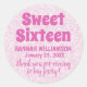 Texto rosado sobre fondo rosa texturado suave. Dulce Dieciséis está escrito en un texto rosa negrita. Tu nombre y tu cumpleaños están escritos en una simple letra rosa profunda. Gracias por venir a mi fiesta está en el mismo color rosado, pero se ve más claro, porque es un tipografía de guión lindo. Dulce manera rosa de agradecer a sus invitados por compartir su día con ustedes.