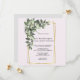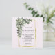 Elegante invitación a bodas con flores de hojas verdes y polvorientas para bodas de primavera o verano. Los detalles están cuidadosamente colocados dentro de una forma de diamante dorado rodeada de flores de color blanco y vegetación en los colores rústicos de primavera y verano, como rosa, marfil, rubor y verde.