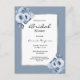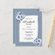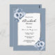 Delante: Un fondo azul polvoriento clásico con un marco falso en blanco y plateado. Decorado con flores de color acuático, florales en tonos azules. Plantillas para el nombre de la novia y detalles del fiesta. El nombre y el texto: Las novias se escriben con un guión de estilo con letras a mano, letras de color negro. Fondo azul polvoriento oscuro. Sugerencia: Si no desea que se vea como una postal, haga clic en personalizar, vaya a la parte posterior y quite el separador y el sello postal.