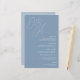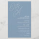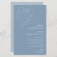 Una hermosa tarjeta de menú boda basada en tipografía con sus iniciales en letras de guiones sobredimensionadas en la parte superior, en tono de tonos para un efecto de marca de agua. Personalice los elementos de menú que se encuentran debajo, alineados a la derecha. Nuestro colorante Dusty Blue es una elegante mezcla de azul etéreo, con letras blancas y azules-grises sobre un polvoriento fondo azul medio.