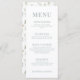 Aumente el encanto de su recepción nupcial con estas sofisticadas y elegantes tarjetas de menú botánico boda. Decorada con delicados guiones de caligrafía verde polvorienta y hojas de eucalipto con vegetación en la parte posterior.