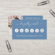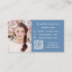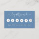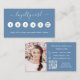 Un fondo polvoriento y moderno de color azul, texto blanco Al frente: Añade un descuento. Atrás: Personaliza y agrega tu foto, nombre, título, número de teléfono, correo, dirección del sitio web, código qr a tu sitio web.