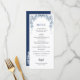 Delight your guests with this beautiful dusty blue floral wedding menu card! Framed by an intricate border of soft blue roses, delicate blooms, lush greenery, and subtle swirling accents, this elegant design lists your reception delights: starters like Caesar Salad with Croutons and Lobster Bisque Soup, mains featuring Filet Mignon with Mashed Potatoes & Roasted Asparagus or Chicken Marsala, vegetarian Penne with Roasted Carrots, dessert options including Wedding Cake, Cupcakes & Brownies, plus an open bar with coffee/tea. Personalized with "Enjoy! SAMANTHA & MARONE AUGUST 26 2022" at the bottom—perfect for table settings, matching your dusty blue suite, and creating a polished, romantic dining experience. Ideal for classic, garden, or boho-inspired weddings!
