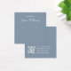 Una simple tarjeta azul polvorienta para la presentación de los anillos: sólo texto blanco sobre un fondo azul polvoriento (una moderna sombra de azul), con los lugares de los anillos indicados por dos círculos muy pequeños. El nombre está escrito en un guión elegante. Tiene códigos QR en la parte posterior, en la parte inferior, a la izquierda de la información.