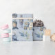 Papel de envolver de Navidades de la época victoriana del azul turbio - Este papel de envolver de regalo de vacaciones presenta un delicado diseño de patrón impecable de azul pastel, marfil, crema, oro y Navidades de ephemera de la época victoriana, de color blanco y lujoso, con ilustraciones temáticos de antaño, sobre un polvoriento fondo azul cielo claro. Las representaciones gráficas incluyen a Santa Claus, un tren, un petardo, campanas de plata, regalos de Navidad, un carruaje, velas de pilar, un árbol de Navidad decorado, un niño, un pájaro, follaje de temporada, guirnaldas festivas y más.