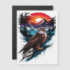 Digital illustration of a red-tailed hawk perched on a blue splattered rock. The hawk has detailed brown and white feathers, yellow talons, and a sharp yellow beak. Behind it, a vibrant sunset with a red-orange sky, silhouetted pine trees, and snow-capped mountains. The background features dynamic brush strokes and splatters, blending realism with abstract art styles. The overall color palette includes rich browns, whites, blues, and reds.