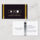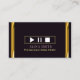 Esta tarjeta de visita está diseñada para el editor de vídeo profesional, la gráfica de vídeo matrimonial y los servicios de edición de vídeo personal. Este elegante diseño moderno a ambos lados presenta una franja dorada en el fondo negro con iconos parados de pausa.