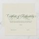 Elegante certificado de autenticidad en cáscara de huevo y verde oliva con un guión de caligrafía rápida. Certificado de autenticidad de color verde oliva blanco y negro con un guión elegante y rápido que puedes personalizar con tu nombre y, en la parte trasera, sitio web, medios sociales o tienda web.