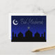 Ilustracion de Eid Greeting: Letras de Eid Mubarak hechas con brillantes estrellas, Luna con una gran estrella y una silueta de mezquita sobre un fondo del cielo nocturno.