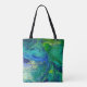 El acrílico vierte diseño fue creado en una lona grande después fotografiado y lugar sobre la esta bolsa de asas colorida preciosa.