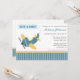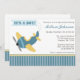 Una invitación de la fiesta de bienvenida al bebé del aeroplano en sombras del azul, del amarillo y del blanco. Perfeccione para una fiesta de bienvenida al bebé temática del aeroplano. ¡Personalice fácilmente para su fiesta!