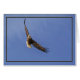 Un águila calva adulta en un giro agudo resaltado por un cielo azul.
