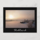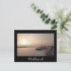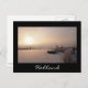 Postales con salida de sol sobre un canal helado con nieve y un bote con algunos molinos de viento en invierno en Kinderdijk en los Países Bajos con una frontera negra y el texto: 'Holanda'.