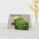 Tarjeta de felicitación que dice el feliz cumpleaños que ofrece el loro dirigido amarillo del Amazonas. El interior es en blanco para su propio mensaje.