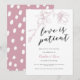 Elegante y moderna tarjeta de anuncio de aplazamiento de boda con una ilustración dibujada a mano de flores de magnolia en color rosa polvoriento con un texto en letra script debajo que dice "el amor es paciente".