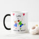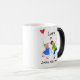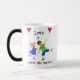 Una taza verdaderamente única. Cuando hace frío, es sólo una simple jarra negra. Cuando añades cualquier bebida caliente (agua, té, café, etc.), tu imagen de collage de papel pintado a mano cobra vida en colores vibrantes. 11 oz. de Sólo lavado a mano.