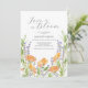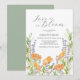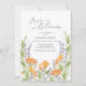 Celebra tu día especial con estas invitaciones florales de acuarela, que presentan delicadas flores silvestres en tonos naranja y lavanda, hermosamente acentuadas con hojas de salvia botánica en verde. La elegante escritura de caligrafía dice "El amor está en flor", lo que hace que estas invitaciones de boda boho chic sean perfectas para un brunch floral, una cena de despedida de soltera o una despedida de soltera botánica.
