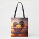 Bolsa de Tote de Fe de tamaño mediano. Una roca en forma de corazón en la playa, con una impresionante puesta de sol brillando a través del corazón con el "AMOR NUNCA FRACASA". El texto es el personalizable de hacerlo único y personal para usted.