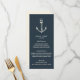 Diseñado para coincidir con nuestras invitaciones y accesorios de boda The Blue Compass, este menú boda de moda náutica presenta un ilustracion de ancla dibujado a mano de estilo vintage en azul marino. Perfecto para bodas náuticos, de playa o de verano. Este diseño es parte de una colección, por favor visite nuestra tienda para ver los artículos que coincidan. Para obtener ayuda o solicitar ayuda, póngase en contacto con nosotros en citronelladesign@gmail.com
