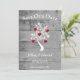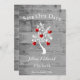Personalice una invitación boda única con un árbol rojo de corazones para guardar la fecha. El diseño de la invitación tiene un fondo de madera gris adornado con un árbol con corazones floridos en sus ramas y un texto que puedes personalizar con los detalles de tu fecha boda. Además, guarde el anuncio de fecha disponible para este diseño en una variedad de colores.