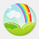 un ilustracion colorido de un lindo arco iris y una nube sobre un paisaje de hierba verde.