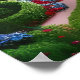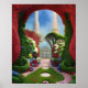 El poster artístico cuenta con un fantástico jardín al estilo de Wonderland, dominado por arbustos de manicura roja y plantas con flores. - Una pintura de arte digital creada con software de generación de IA.