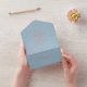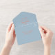 Una invitación a una boda todo en uno, de color azul polvo y melocotón, exuda elegancia, sofisticación y un toque de belleza natural, ofreciendo una manera perfecta y cómoda de compartir tu día especial con tus seres queridos.