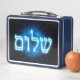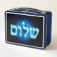 La brillante lectura de texto en hebreo azul y blanco, "Shalom" (ש ל ם - paz), superpuesta a una elegante imagen fractal en azul y con aspecto grabado de una Estrella de David.