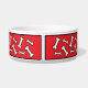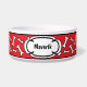 Cuenco divertido de la comida de perro con un modelo de los huesos de perro contra un fondo rojo brillante. Añada el nombre de su perro.