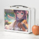 Adorable chica de anime de pelo marrón azul tocando el violín.