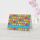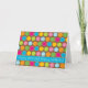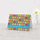 Puntos coloridos de las características del este de cumpleaños diseño de tarjeta con los esquemas que ponen en contraste en un fondo marrón. ¡La raya azul a través de una tarjeta más baja ofrece el texto enrrollado que dice "feliz cumpleaños! Feliz cumpleaños!"