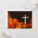 Foto conceptual del cielo y el infierno. Cruz blanca fotografiada de noche, con hortensias borrosas en primer plano.
