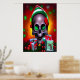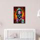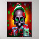 Un cráneo con un Navidad verde beanie sobre un fondo rojo, amarillo, verde y presente navideño frente al cráneo. Este es un arte generado por IA.