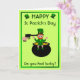Diseños soleados de Marte del ©. Leprechaun que se sienta en tarjeta de felicitación del día de un St Patrick de la mina de oro - este la tarjeta del día del St Pat ofrece un ilustracion del dibujo animado de un leprechaun que se sienta en una mina de oro con sus brazos para arriba en el aire y un arma señalado en su cabeza con las palabras "usted siente afortunado?" escrito abajo.