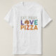 El diseño de las camisetas se come para rezar y amar la pizza La camiseta subvierte dramáticamente el título del libro/película "Comer, rezar, amar" reemplazando "Amor" por "Pizza". Es probable que incluya texto con "Comer" "Rezar" y "Pizza" en un estilo de letra similar, posiblemente apilado uno encima del otro. También puede haber un gráfico de una porción de pizza para representar visualmente la palabra reemplazada.