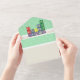 Esta invitación con temática científica "todo en uno" con tarjeta RSVP extraíble presenta un fondo de paramécio en verde pálido en una base verde primavera. En la parte superior de este patrón se encuentran los paneles de crema con una línea blanca para dar la impresión de una baseboard en la parte inferior de una pared que proporciona una base para el texto de muestra en el interior que se puede personalizar para su evento y el espacio en blanco en el exterior que se puede usar para dirigir las tarjetas al destinatario y la sección que se puede devolver con la dirección de retorno apropiada. Finalmente, un conjunto de bloques de alfabeto de madera con temática biológica, con la secuencia de ácido nucleico que conforma telomeres humanos, se sienta sobre la solapa por encima del texto y en la parte posterior cuando se cierra. Mezclados alrededor de las bases hay bloques con una variedad de íconos microscópicos y macroscópicos para mostrar algunos de los conceptos y campos asociados con la biología, incluyendo una flor, un plato de Petri, un bacteriófago y una neurona. No olvide visitar la colección de Bloques del Biólogo Futuro para más regalos y productos para una ducha de bebé o la pequeña de su vida.