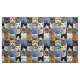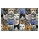 El gato se enfrenta al tejido de collage. Las imágenes de gatos y gatitos cubren este material en cuadrados. Gran patrón de gatos negros, blancos, tabby y tigres con ojos verdes, amarillos y naranjas.