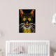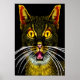 Un gato adorable y adorable con ojos amarillos y piel oscura, que tiene miedo de algo, en un fondo negro. Este es un arte generado por IA.