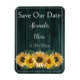 Anuncie su próximo día de boda para la familia y los invitados con un Rústico Girasol Verde azulado Salven el imán de la fecha. El diseño del Magnet presenta un fondo rústico de madera con un elegante ramo de girasoles. Personaliza con los nombres del novio y la novia junto con la fecha del boda. También hay artículos de papelería y regalos adicionales para bodas disponibles con este diseño.