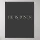 Este arte mural cristiano minimalista presenta la poderosa proclamación de Pascua "Él ha resucitado" en tipografía serif elegante sobre un fondo de carbón profundo.