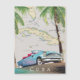 Mapa ilustrado de Cuba (más las islas circundantes) en un hermoso estilo vintage detallado con un clásico auto cubano antiguo al atardecer.