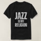 El diseño de la camiseta "Jazz es my Religion" presenta un tipo de letra atrevido y estilizado que capta la esencia de la cultura del jazz. El texto se integra creativamente con elementos musicales como saxofones, trompetas y notas, todo ello enmarcado en un fondo vibrante y abstracto que evoca el ritmo y la energía de un club de jazz. La paleta de colores incluye el azul profundo, las violetas ricas y los toques dorados que recuerdan a la estética clásica del jazz. El conjunto es a la vez artístico y llamativo, para los amantes de la música y del jazz.
